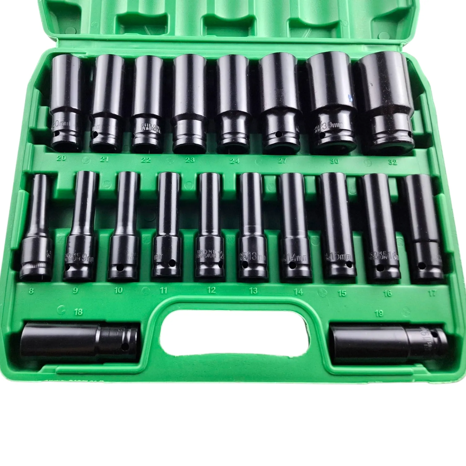 Комплектация головок: 8,9,10,11,12,13,14,15,16,17,18,19,21,22,23,24,27,30,32 мм.