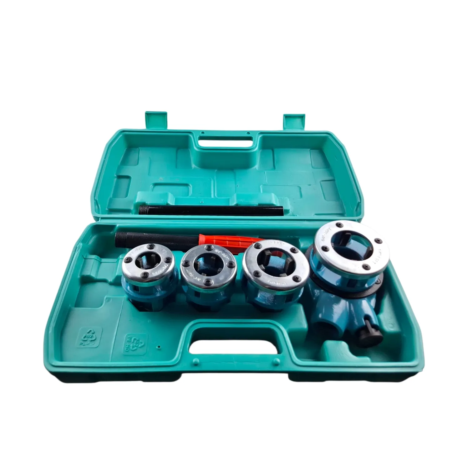 Каждая резьбонарезная головка имеет четыре отверстия для удаления стружки. Длинная ручка обеспечивает максимальное кручение при нарезании резьбы. Набор поставляется с пластиковой коробкой, что позволяет удобно транспортировать и хранить инструменты. Головки для нарезания резьбы изготовлены из чугуна, прочного и износостойкого. Резьбовая плашка: 1/2", 3/4", 1", 1-1/4" Тип резьбы: цилиндрическая трубная резьба 55 °.